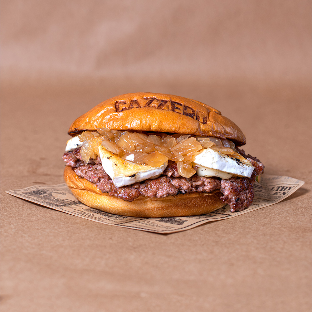 Pão brioche, 2 carnes smash 70g 100% Vaca, queijo Brie, cebola caramelizada e maionese. Batatas incluidas.