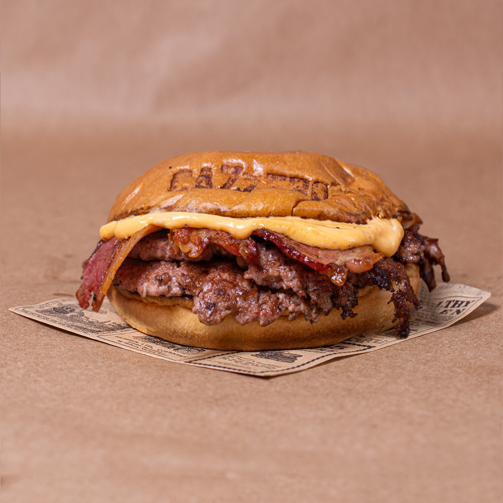 Pão brioche, 2 carnes smash 70g 100% Vaca, bacon crispy e cheddar cremoso com bacon. Batatas incluidas.
