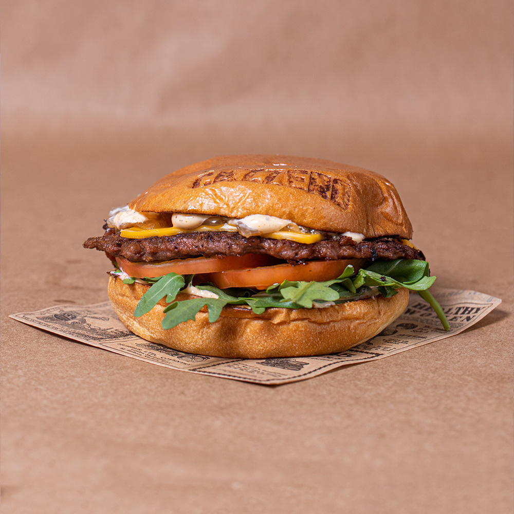 Pão brioche, Beyond Burger ®, cheddar vegan, rúcula, tomate, cebola caramelizada e maionese vegan. Batatas incluidas.