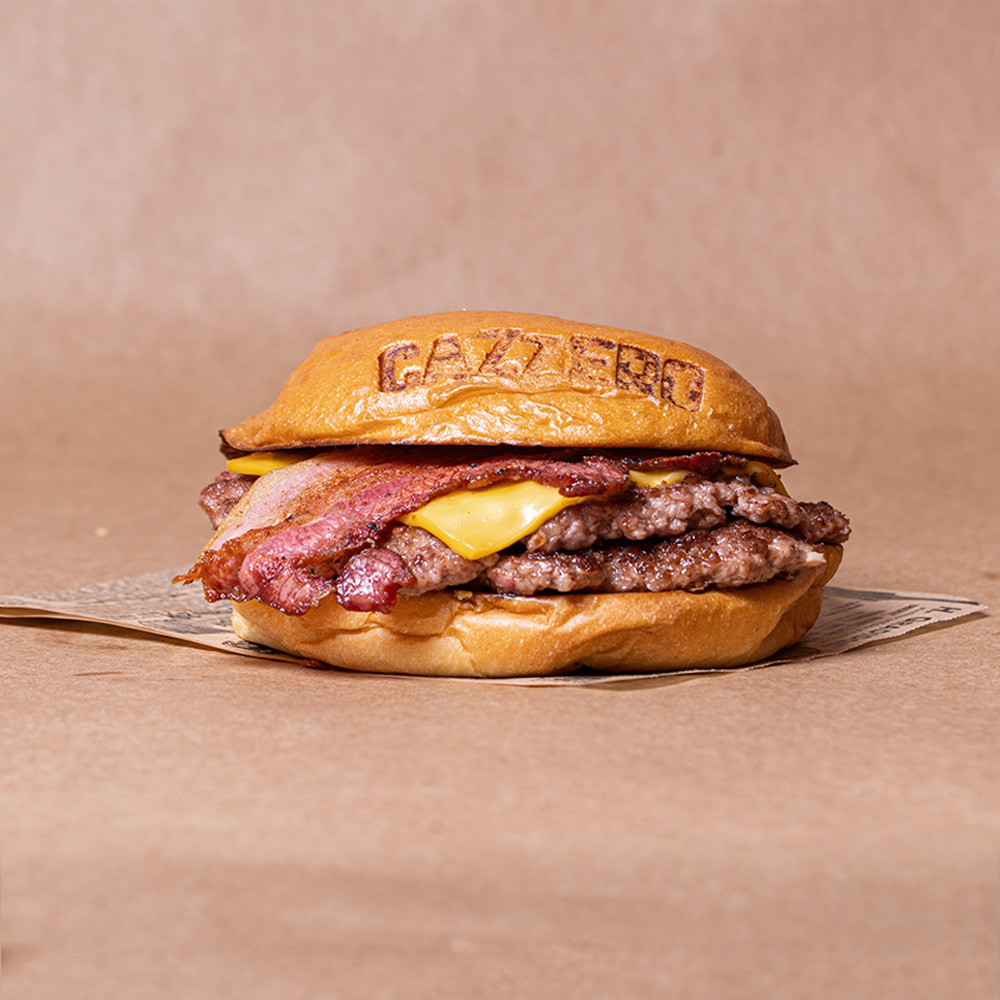 Pão brioche, 2 carnes smash 70g 100% Vaca, fatias de bacon, fatias de cheddar e maionese. Batatas incluidas.